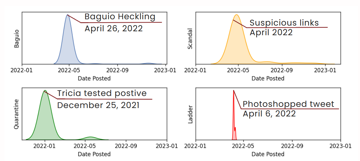 The Baguio incident disinformation tweets were possibly triggered by the heckling at the Baguio Public Market on April 26, 2022. The Scandal incident disinformation tweets were possibly triggered by the surfacing of suspicious links on April 11, 2022. The Quarantine incident disinformation tweets were possibly triggered by Jay Sonza's Facebook post on December 25, 2021. The Ladder incident disinformation tweets were possibly triggered by Jam Magno's tweet on April 6, 2022.