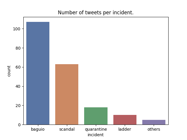 It is interesting to note that Jillian Robredo is the Robredo sister that is mentioned most among the tweets. This is because the Baguio incident is the incident with the highest number of mentions, as seen in the "Number of tweets per incident" barchart.