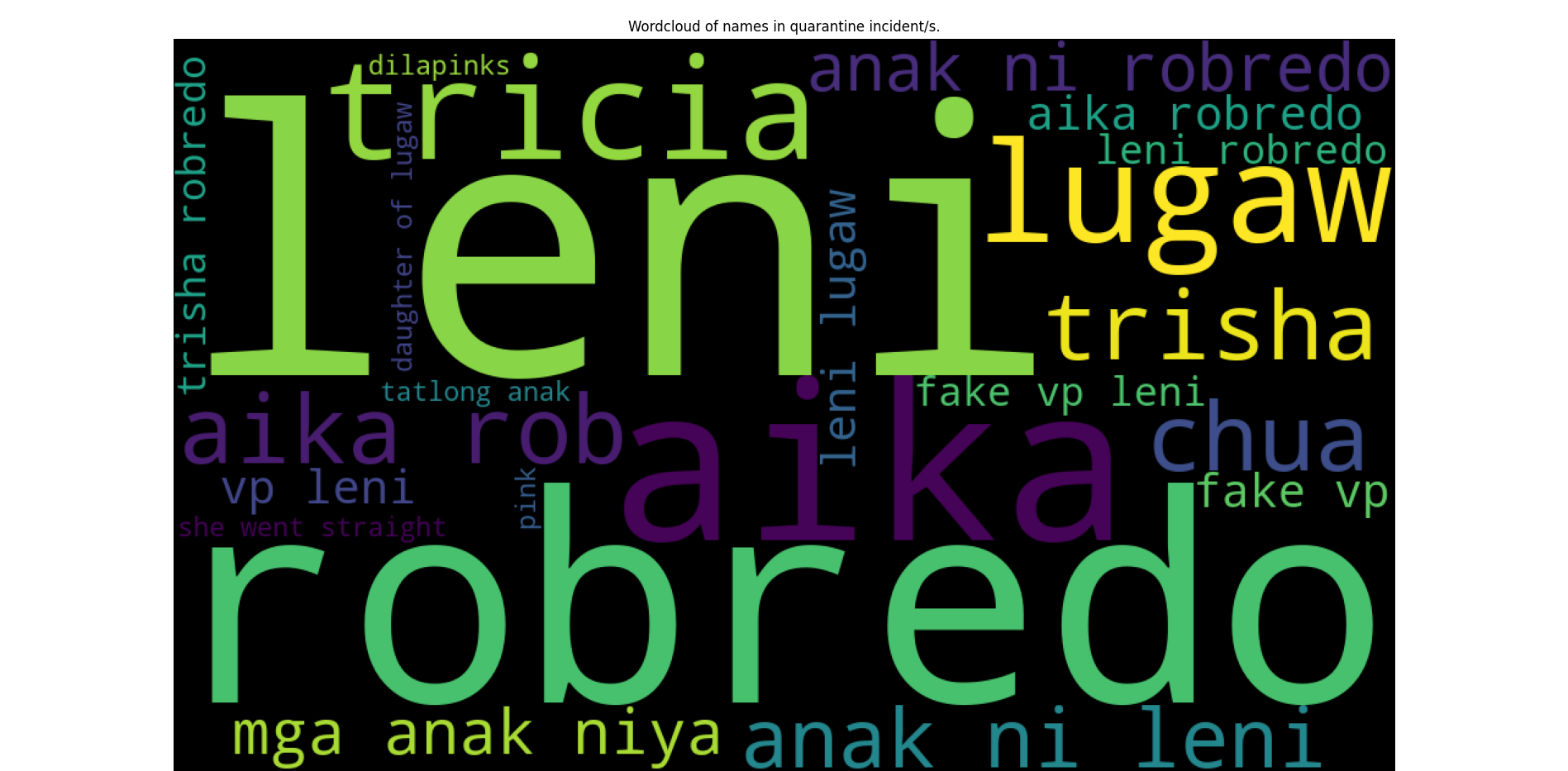 Now, it is interesting to observe the medium-size aliases. No disinformation incident fell short in mentioning Leni Robredo and her aliases such as "lutang" and "lugaw." This is a confirmation of the real world observation of the team, that Leni Robredo was being implicated in most disinformation incident which is most notable in the Quarantine incident.